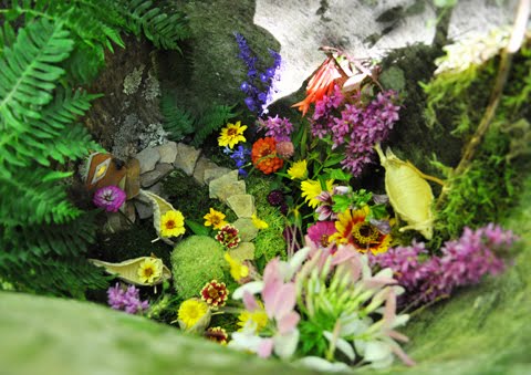 A delicate spiral stone path led down from the door and up to a gorgeous tuffet of pale green moss. The flowers were a riot of colour and texture! I could see three tiny Faerie sized seating areas arranged in a circle around the moss. The seats were Milkweed pods with tiny cushions of yellow flowers places inside each one. And there was even a Milkweed pod sleeping nook high above the garden. It's hard to see from this angle, so here is a better view.